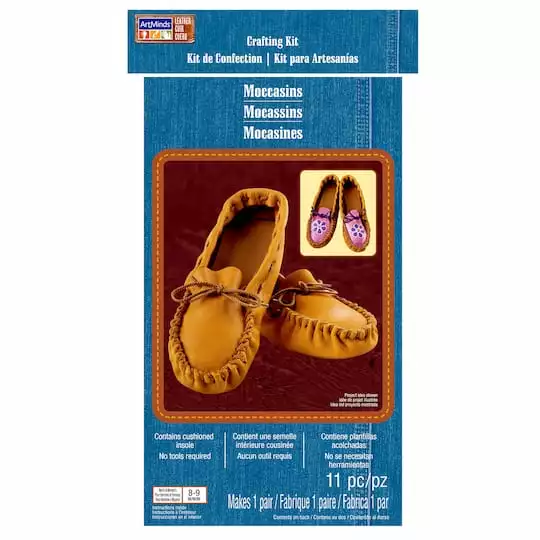 Just lace up and go! This kit has everything you need to make your own pair of leather mocs. Made out of deertan cowhide, they are durable and yet comfortably conform to the shape of your feet. No tools required, since all of the golden tan-colored parts are pre-cut and pre-punched and the cushiony insoles are pre-attached. Moccasins are medium width.