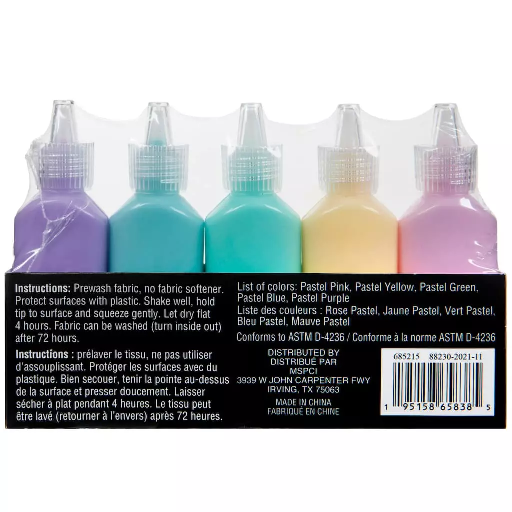 Make a fun and one of a kind shirt with these super cool pastel fabric paints. It includes 5 colors guaranteed to help bring your creations to life!