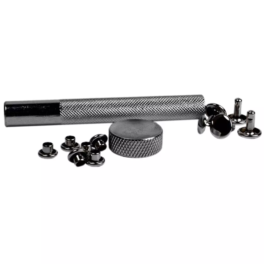 Set rivets in leather or canvas quickly and easily with this kit. Rivets are one way you can attach two pieces of leather together, so they are ideal for leather key fobs, belts, handles and more.